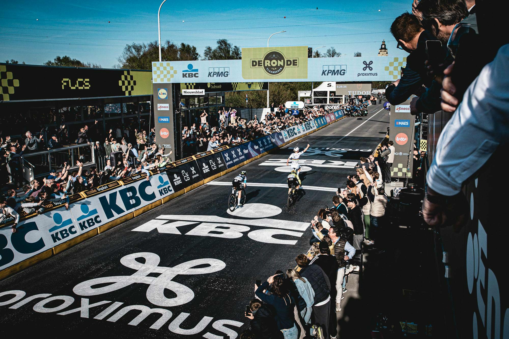 Lotte Kopecky has claimed her third victory in the Tour of Flanders. She accelerated on the Oude Kwaremont, creating a leading group of four that rode together to Oudenaarde. In the sprint, she beat Pauline Ferrand-Prévot, Liane Lippert, and Katarzyna Niewiadoma. With this new win in Flanders’ Finest, Kopecky crowns herself the sole record holder.