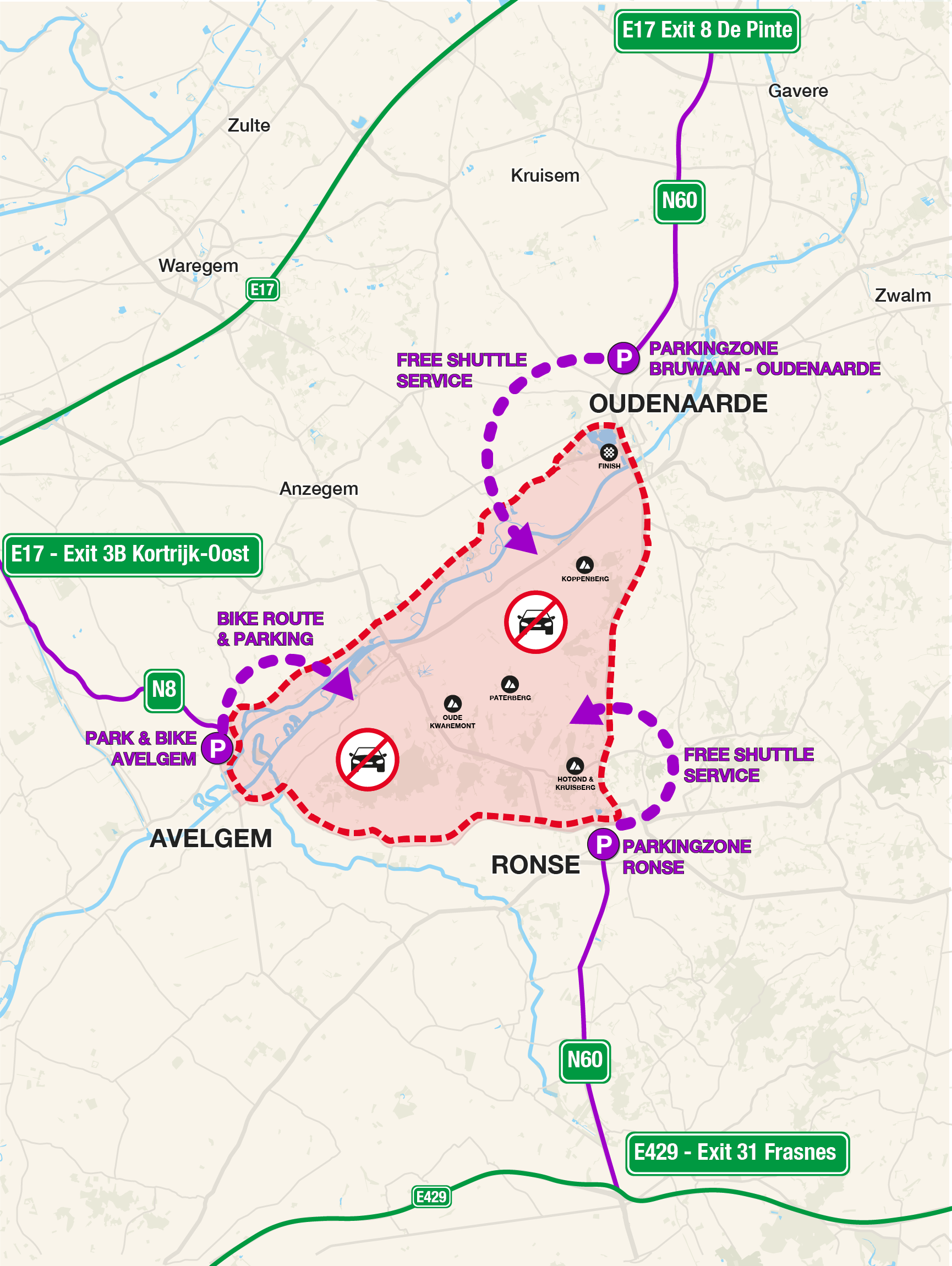 During the Tour of Flanders, a traffic-free zone will be in operation in the wide area around the finish zone in Oudenaarde, Oude Kwaremont, Paterberg, Hotond and Kruisberg. That means no cars are allowed on the Sunday. To visit that hill zone and the finish in Oudenaarde, use one of the car parks on the edge of the closed zone.